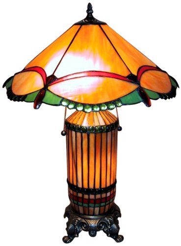 This stunning dragonfly table lamp design features 193 pieces of Tiffany-style cut glass with 88 cabochons and a night light built into the base. Transform a table with this eye-catching table lamp. Antique bronze finish. Zinc alloy and glass base. Tiffany-style shade. Night light built into base. Takes two 60 watt bulbs (not included). Includes one 7 watt night light bulb. Two pull chains. 25" high. Shade is 18" wide, 7" high.