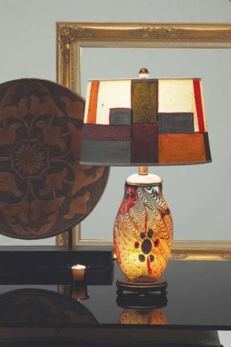 Brighten your favorite area with the Doxy table lamp. The design features an art glass base with multiple patterns and designs. Shade has an earth-tone geometric pattern. A built-in night light in the base offers an intimate lighting choice at night. Takes one 100 watt bulb (not included). Includes one 15 watt night light bulb. 23 1/2" high. Shade is 12" across the top, 14" across the bottom and 9" on the slant.