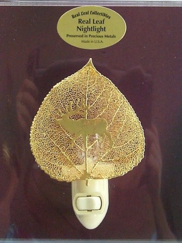 Each one of these delicate glittering gems began as a real leaf. First, they are made semi-transparent through an intricate filigree process. Then, to strengthen and preserve each one, a delicate layer of Gold is applied. Finally, the leaves are individually dipped into molten Gold. No two leaves are ever exactly alike. Approximately 3 inches high.Each Night Light come in a Gift Box ready to wrap as shown in the picture.It is hard to see the elk silhouette on the gold so we have included the iridescent copper with the light on. If you enlarge the gold you will see the Elk. Sorry I don't have an image of gold with the light on.