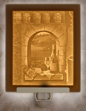 "Fruit of the Vine Flat Porcelain Lithophane Nightlight , Our most popular Lithophane product is the plug-in night light. First invented in France in 1827, a Lithophane is a porcelain engraving that virtually comes alive when illuminated from behind! The image is created by a panel of different thicknesses of translucent, kiln-fired porcelain. A breathtakingly detailed picture in warm sepia tones emerge when lit. The small shadow in our pictures is due to photographic light and is not visible in your home. These illuminated artworks are so detailed, that they will amaze you for years to come. Our Night Lights are the perfect gift, reasonably priced and nicely gift boxed.They include history and care literature. Our exclusive clip mounting allows our Night Lights to be plugged into any electrical outlet, including outlets that are installed sideways or upside down. Each panel is approx. size 3.5 inches x 4.5 inches. The flat panels are interchangeable with any of the flat panel designs so you can change them easily. They are also available in other styles in our store. Some in color. UL Listed."