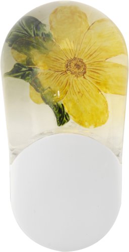 This night light cycles through red, blue, green, and multi-color phases, lighting the yellow flower drawing. This night light can be positioned so that it will not block a second electrical outlet. A light sensor automatically switches the night light on and off. Fluid filled flower design. Multiple color phases. Automatic on/off. Energy efficient. Includes LED bulbs. 7 1/2" deep. 4 1/4" wide. 2 1/4" high.