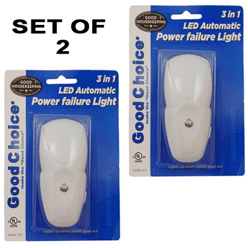 Great for kitchens, bedrooms, stairs and hallways. The LED area light automatically turns on when the power goes off. The LED area light will turn off when the power comes back on. Comes equipted with a rechargeable super bright LED flashlight and automatic photo sensor night light. Includes 3 AAA RECHARGEABLE BATTERIES and 30,000 LED lamp light. Rated 120v AC. Each measures 4.5"H x 2"W. UL APPROVED.Set of 2