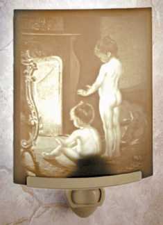 First invented in France in 1827, a LITHOPHANE ("Vision In Stone") is a porcelain engraving that virtually comes alive when illuminated from behind. The image is created by a panel of different thicknesses of translucent, kiln-fired porcelain. A breathtakingly detailed picture in warm sepia tones emarge when lit. These illuminated artworks are so detailed, that they are sometimes mistaken for photographs. THE DARK AREA AT THE BASE OF THE LITHOPHANE IS JUST A SHADOW IN THE PICTURE. IT DOES NOT SHOW WHEN BEING USED. We have Lithophanes in many products but the most popular Lithophane product is the plug-in Night Light. Our Night Lights are the perfect gift; reasonably priced & nicely gift boxed, including a history of the process and care literature. We have many designs available as night lights, in a variety of themes. Our exclusive clip mounting allows our Night Lights to be plugged into any electrical outlet, including outlets that are upside down.or if installed sideways be sure and tell us as it will require a flat panel. Most of our Night Lights are 3.5" wide by 4.5" tall.
