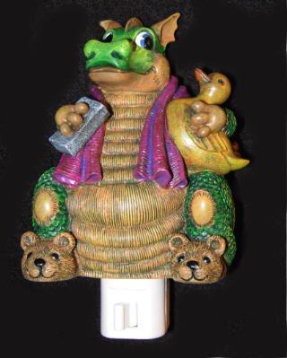 - Beautifully detailed, this nightlight features an adorable fire-breather with his rubber ducky, towel, soap and even his teddy bear slippers