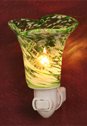 La Bella Luce Green Art Glass. These eye catching and beautiful night lights are handmade in Art Glass, so no two are exactly alike. The delicate color patterns swirl around the elegantly fluted shade, casting lovely designs on the wall. They are as unique as they are beautiful, as no other company offers anything like them, and they are a steal at this price for a work of art. These lovely wall lamps come nicely gift boxed. They feature a unique rotating light base, which allows them to be plugged into horizontal or upside down electrical outlets and still have the shade upright. Complete with 7 watt bulb. Our Night Lights are the perfect gift; reasonably priced & nicely gift boxed, including history and care literature. Approx. size: 4.75 inches High by 3.75 inches wide. UL Listed.