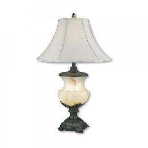 Use these faux alabaster table lamps to set a warm and inviting mood in your living space. The 2 lamps feature sturdy pedestal bases with ornate black frames which complement the faux alabaster finish. Linen shades disperse the light for an ideal addition to a bedroom or living room.Product Features: