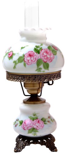 This beautiful antique-style table lamp is patterned after classic oil-burning lamps from the Victorian era and features a hand-painted red rose pattern on the top and bottom glass. With a chimney-style shade on top. Antique brass finish footed base. Artisan made in North Carolina by Summit Lighting. Top switch controls main bulb and night light bulb. Takes one 150 watt bulb (not included). Includes one 7.5 watt night light bulb. 18" high. Shade is 8" in diameter.