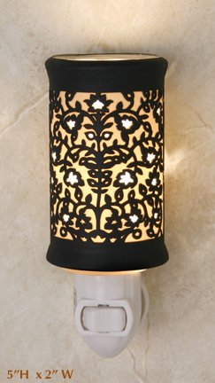 This lovely silhouette night light consists of opaque black porcelain baked over translucent white porcelain. An artist carefully etches the black porcelain away into unique patterns, allowing light to glow through the white layer underneath. For added versatility, the body pivots 360 degrees for mounting in tight spaces. A 7-watt bulb is included, item [17101]. Handcrafted in the U.S.A. This product complies with the Americans with Disabilities Act. DL # 245857.